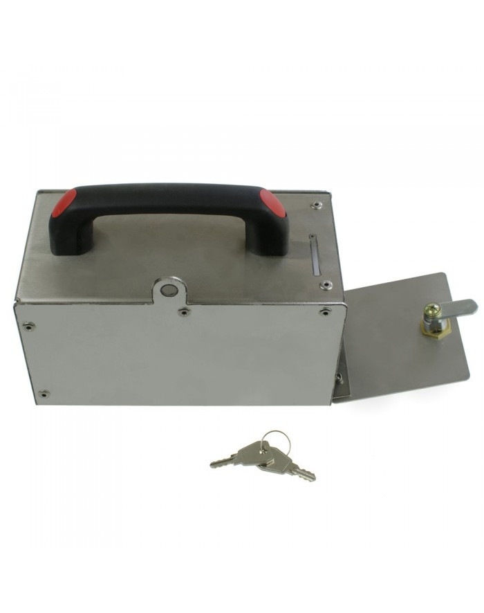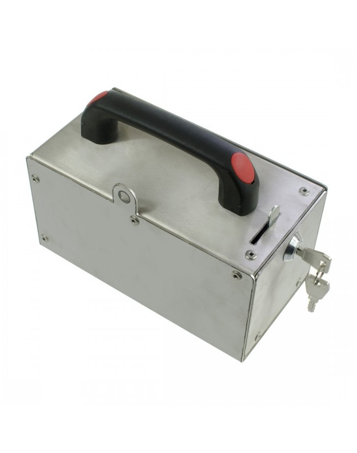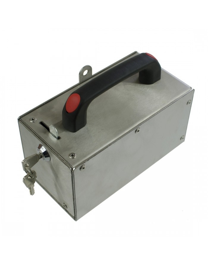 Érme- és zsetonkazetta BKF autómosókhoz rozsdamentes acélból, kulccsal és tartóval.